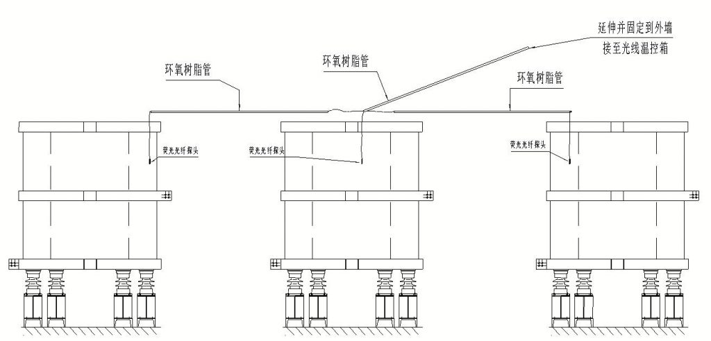 熒光式光纖測溫終端嵌入安裝在箱體,引出的光纖往墻體上部走,高度需要超過電抗器高度,經過安裝在墻壁的環氧樹脂管,三根光纖匯總進入B相電抗器;B相光纖直接安裝在電抗器內部氣道壁內;A、C兩相分別經過架空絕緣的環氧樹脂管引致A相、C相電抗器,安裝在電抗器內部氣道壁內。